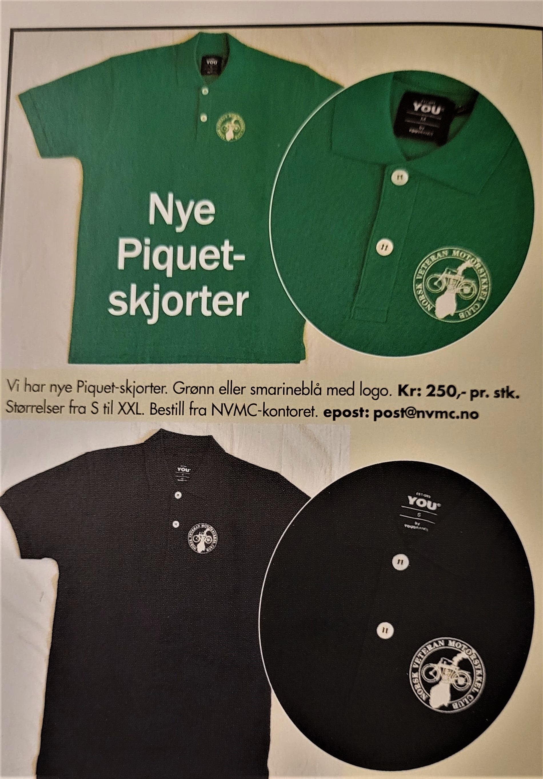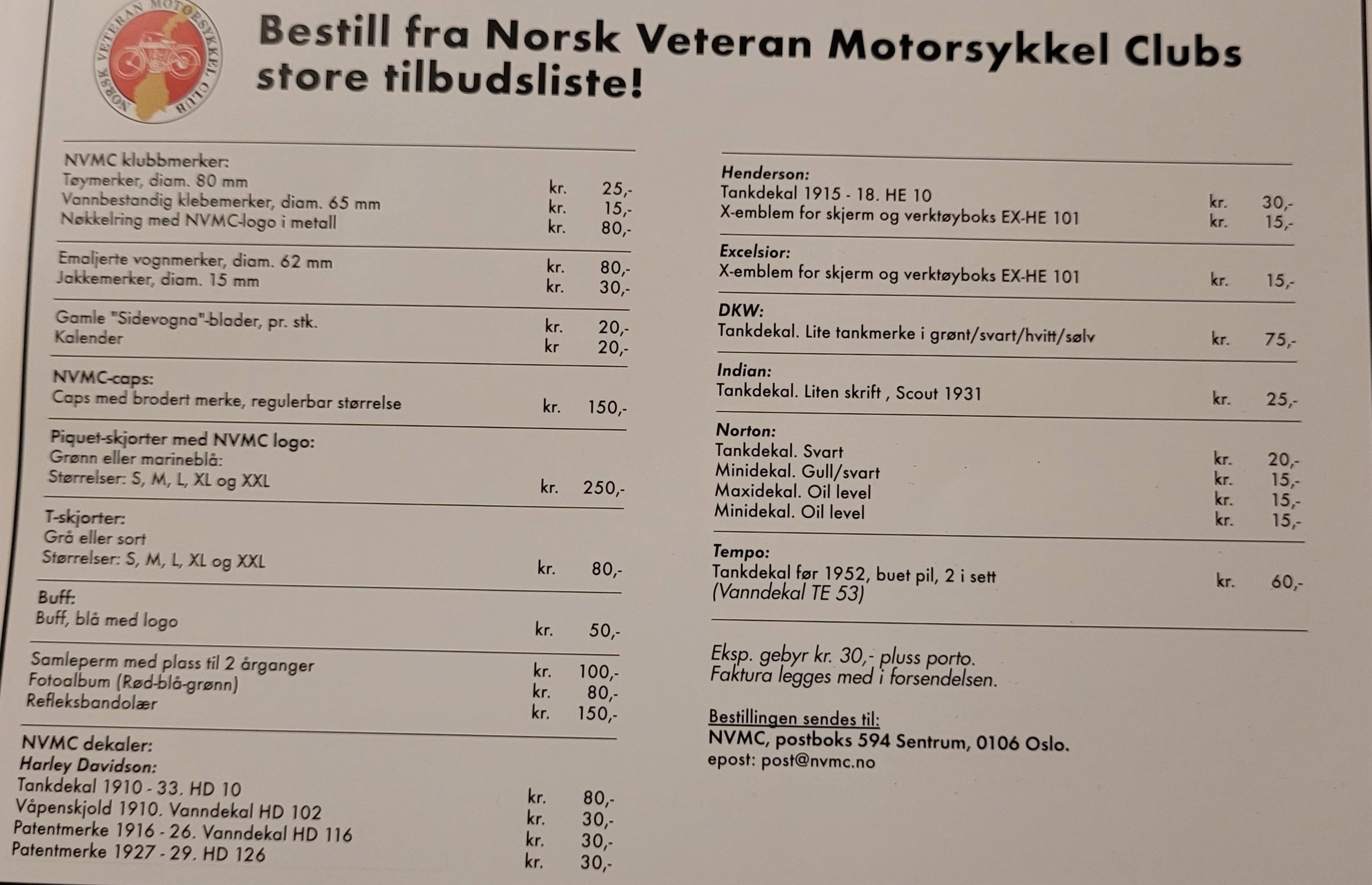 Nå har du mulighet til å anskaffe deg noen flotte klubbeffekter med NVMC logo. Her er bilder av de klubbeffekter som kan kjøpes hos NVMC, ved å sende en mail til vår klubbsekretær på post@nvmc.no. Eller pr.brev til NVMC,postboks 594 Sentrum,0106 Oslo. Info om pris/størrelse/farge ligger under hvert bilde som kommer frem om du trykker på det. Prislisten ligger i sin helhet som et av bildene og som vedlegg i egen fane under medlemseffekter her på siden. Der vil dere også se det utvalg av dekaler vi har til ulike motorsykkelmerker. I tillegg til prisen på varene vil det komme et eksp.gebyr på kr.30,- pluss porto. Faktura legges ved i forsendelsen. Vi oppfordrer lokalavdelingene til å bruke vår nye vervebrosjyrer som ble produsert i 2021, på utstillinger og treff. Dette for å markedsføre NVMC som klubb og slik kunne rekruttere nye medlemmer både til NVMC sentralt og til lokalavdelingene. Send en mail så kommer de gratis i posten.